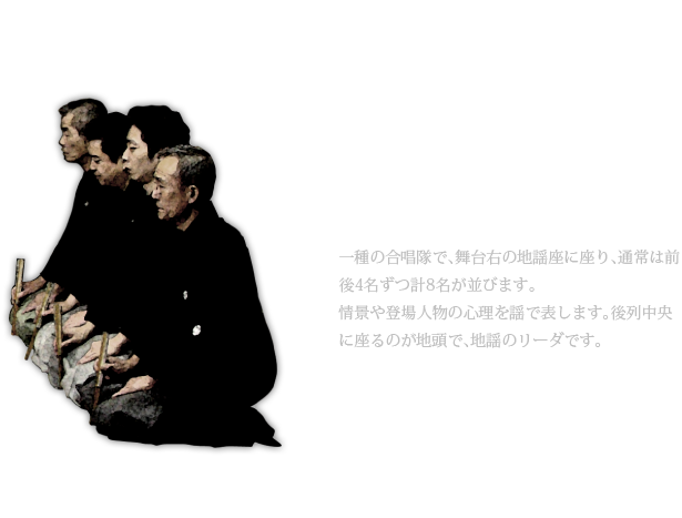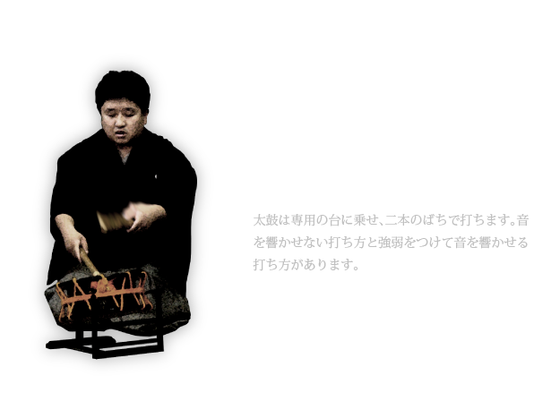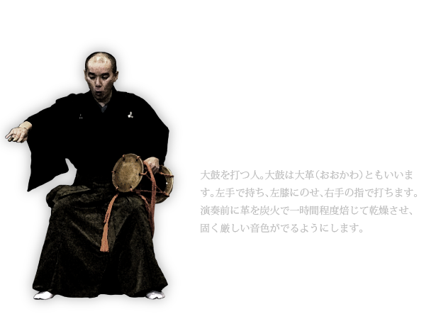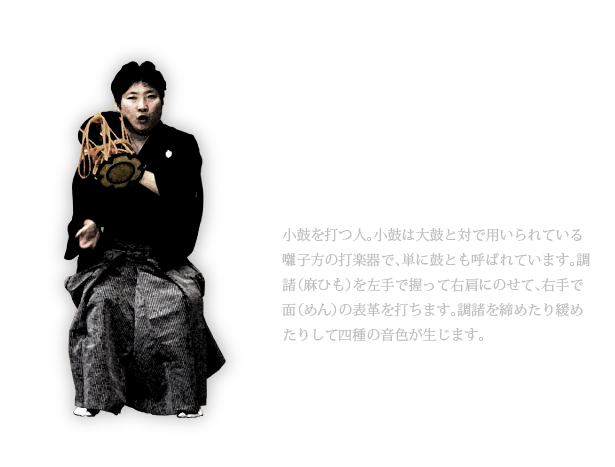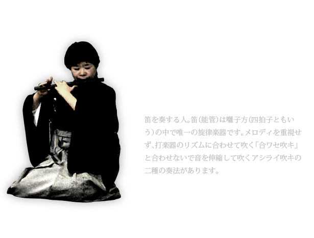 シテ方という俳優を中心にワキ方、狂言方という配役が置かれ、囃子方(はやしかた)が伴奏を行う音楽劇で、世界で一番古い舞台芸術です。日本版オペラとも言われています。