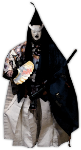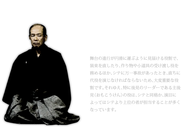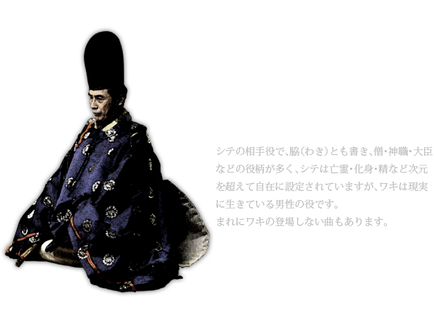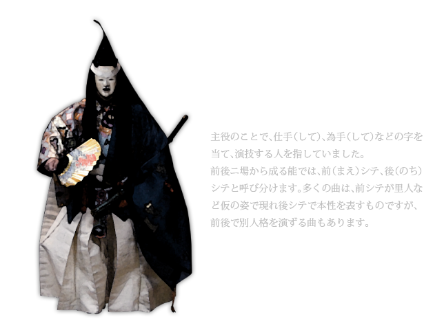 多くの能では前後に物語を分け、前シテ、後シテと主人公を呼び分けます。前シテは仮の姿で、後シテで本性を現します。シテが神や鬼、天狗を演じる場合『夢幻能』といい、人間を演じる場合は『現在能』と呼びます。 -