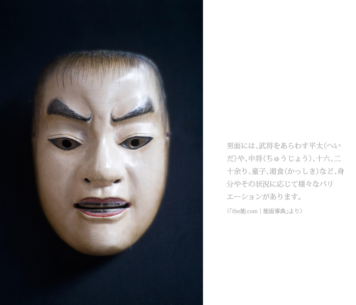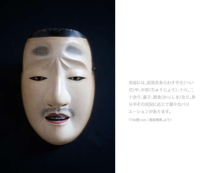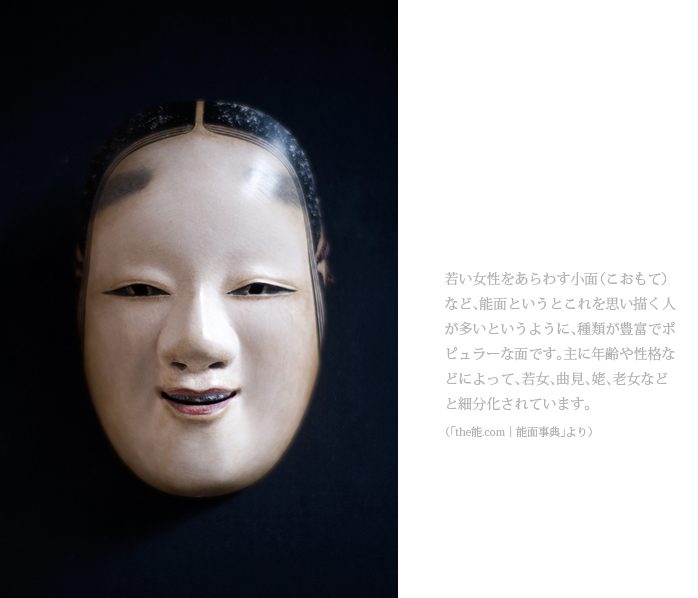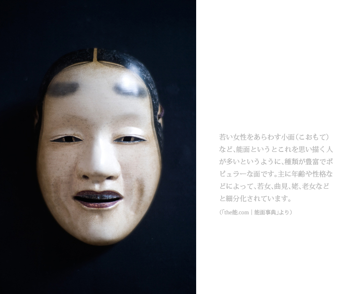 シテが役を演じるのにつけるこの能面のことを面(おもて)といいます。面は大きく分けて「翁面」、「尉面」、「男面」、「女面」、「怨霊面」、「鬼面」の6種類です。これらを更に細かく分けていくとその数は数百にもなります。