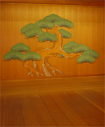 能舞台の正面の羽目板に老松が描かれる理由には諸説あります。むかし奈良県春日大社で神事として能が奉納された際に「影向(ようごう)の松」の前で能が舞われたことに由来するという説や、松は針葉樹であることから常に青々と繁り根もどっしりと生えることから繁栄の象徴とされ、また「神を待つ木」と言われてきたことから御神木として松を描いたという説、そのほか、徳川家の旧姓が松平であることから、将軍家がお抱えの御用絵師に盛大な松の絵を描かせたことに由来するという説もあります。