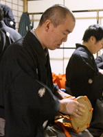 「カーン」といった高い音を響かせる大鼓。これは演目がはじまる2時間ほど前から火鉢で鼓の皮を乾燥させ、その皮をきつく張ることで硬質な音が出るようになるのです。通常は指皮をはめてこの鼓を打つのですが、稽古を積んだ人は素手で打つこともあります。ただ、誰でも簡単に高い音を響かせられるといったものでなく、シテ方、ワキ方、囃子方がそれぞれの役割を替えて演ずる乱能をする際、あまり大鼓を打ったことのない人が大鼓を担当すると、「ボコッ、ボコッ」とにぶい音が響くこともあります。
